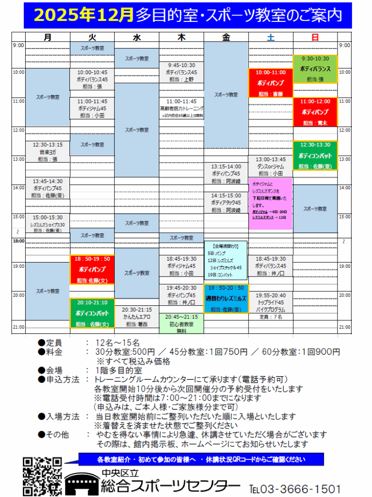 中央区立総合スポーツセンターにてレズミルズプログラム(ボディパンプ・ボディコンバット・ボディバランス)・エアロビクス教室を開催しております