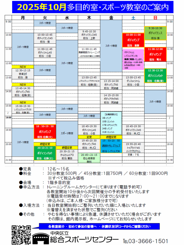 中央区立総合スポーツセンターにてレズミルズプログラム(ボディパンプ・ボディコンバット・ボディバランス)・エアロビクス教室を開催しております